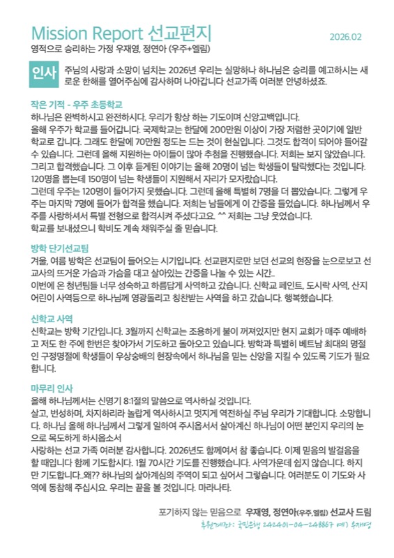 선교편지(02월) - 우재영/정연아 선교사(베트남)